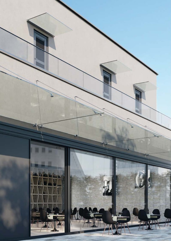 Pensilina con sistema mod. Canopy Glass con tiranti e fori nel vetro, con sbalzo fino a 2 metri, realizzata in vetro temperato, stratificato con plastico intercalare rigido, dal design minimalista e per questo motivo adattabile a qualunque contesto.